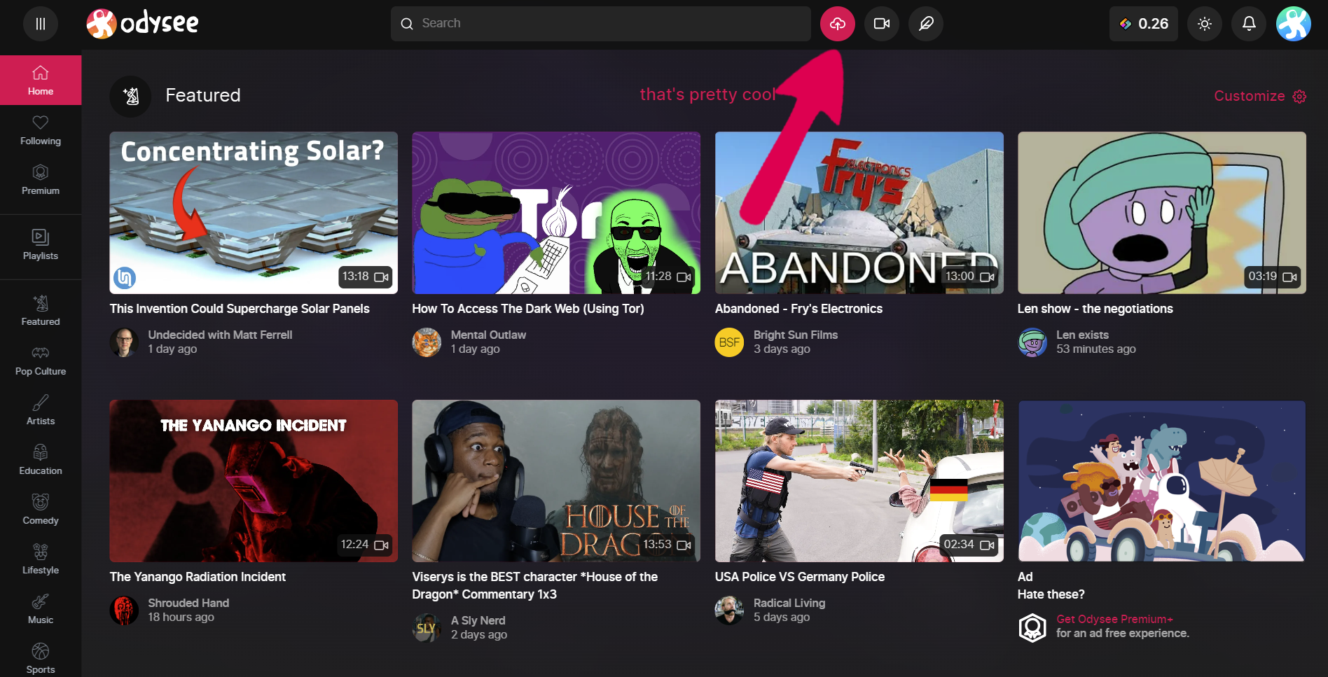 Para videos, deberá cargar archivos MP4 en formato H.264/AAC. Para obtener la mejor experiencia del espectador, recomendamos velocidades de bits inferiores a 8 Mbps. Las cargas de Odysee están restringidas a 16 GB.