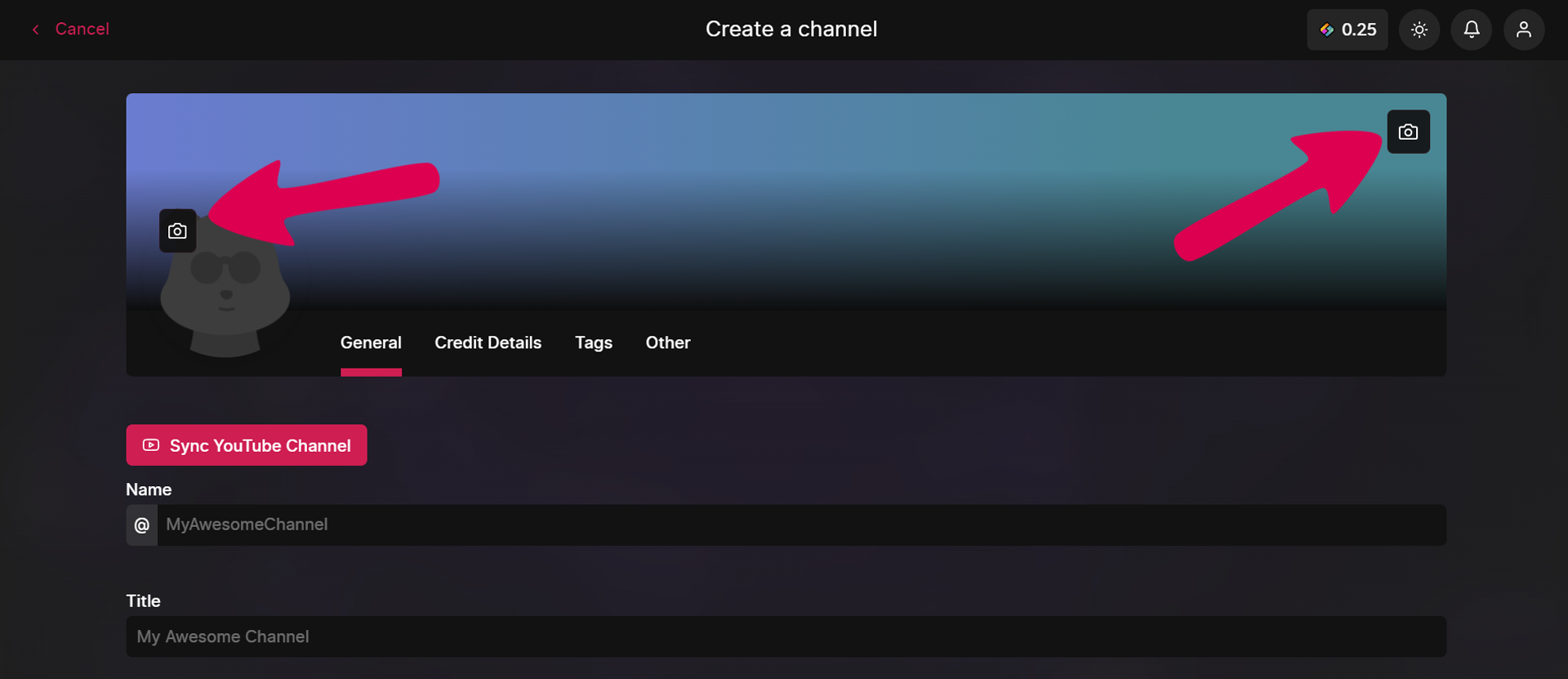 Ao criar um canal, você poderá primeiro definir sua foto de perfil e seu banner usando os botões de câmera.
