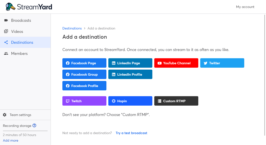 Na tela principal do Streamyard, depois de fazer login, selecione Destinations no lado direito.